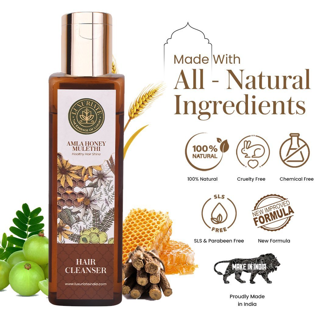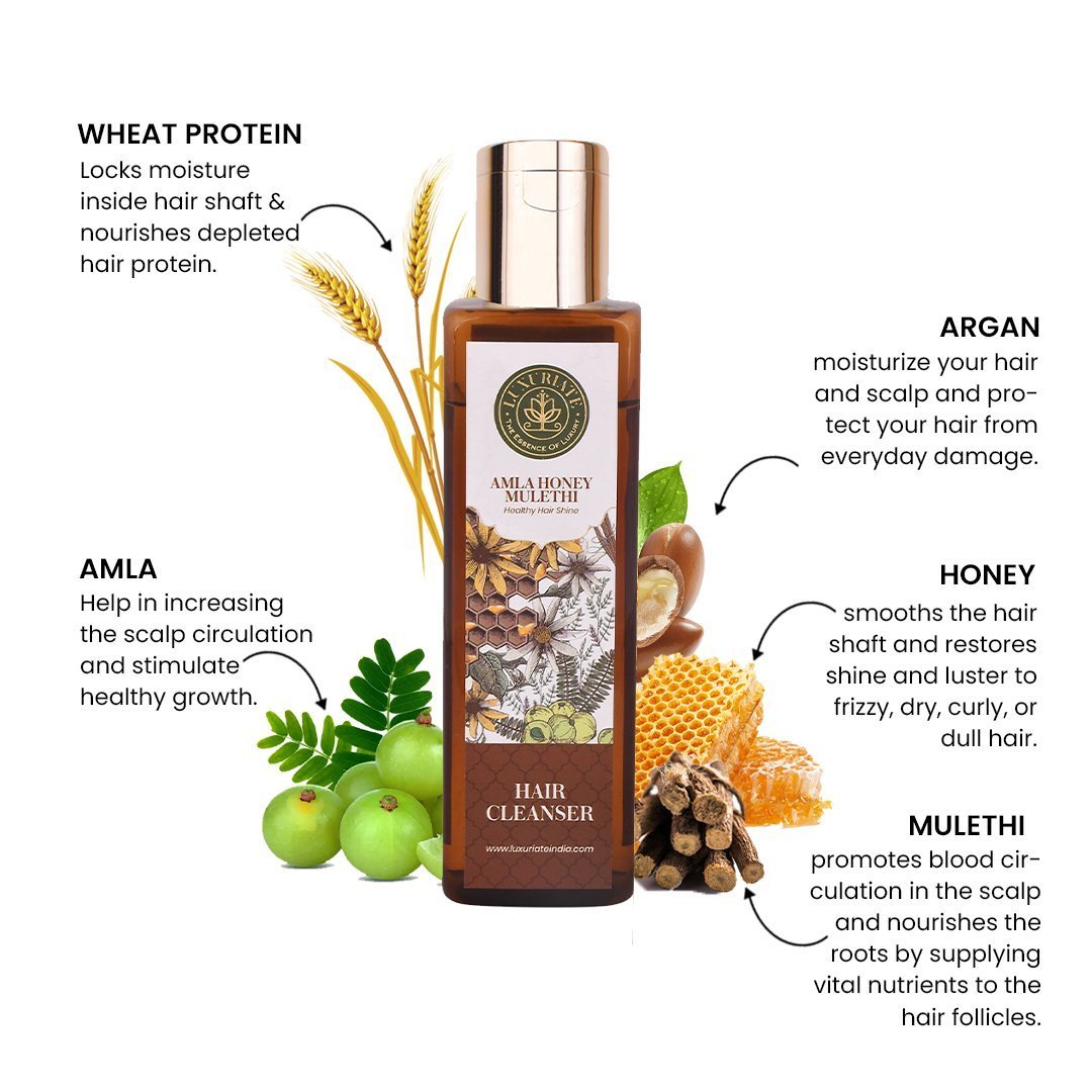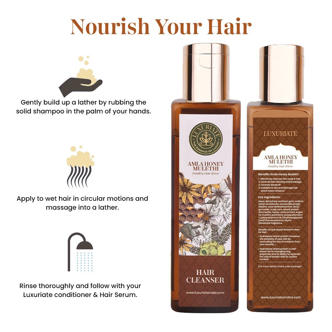 Luxuriate Amla Honey Mulethi Hair Cleanser is an excellent agent to support healthy hair growth. It reduces premature greying and also makes your hair shiny and beautiful. Amla and honey mixture, when applied to hair, can strengthen hair follicles and reduce dryness. It also stimulates hair growth to attain good volume. Rich in Vitamin C, Amla fruit extract conditions the hair making it healthy and smooth. Mulethi extracts detangle the hair.