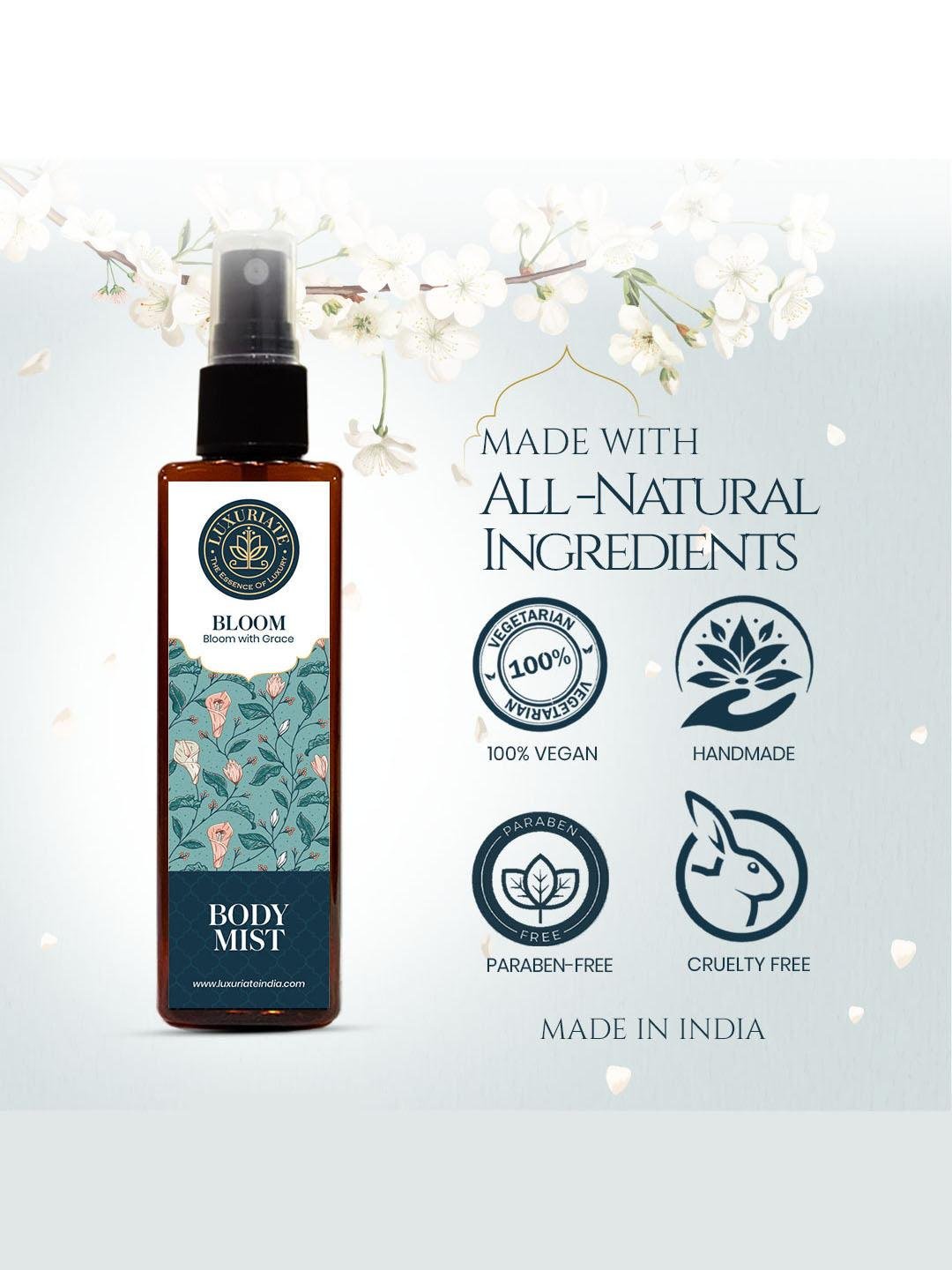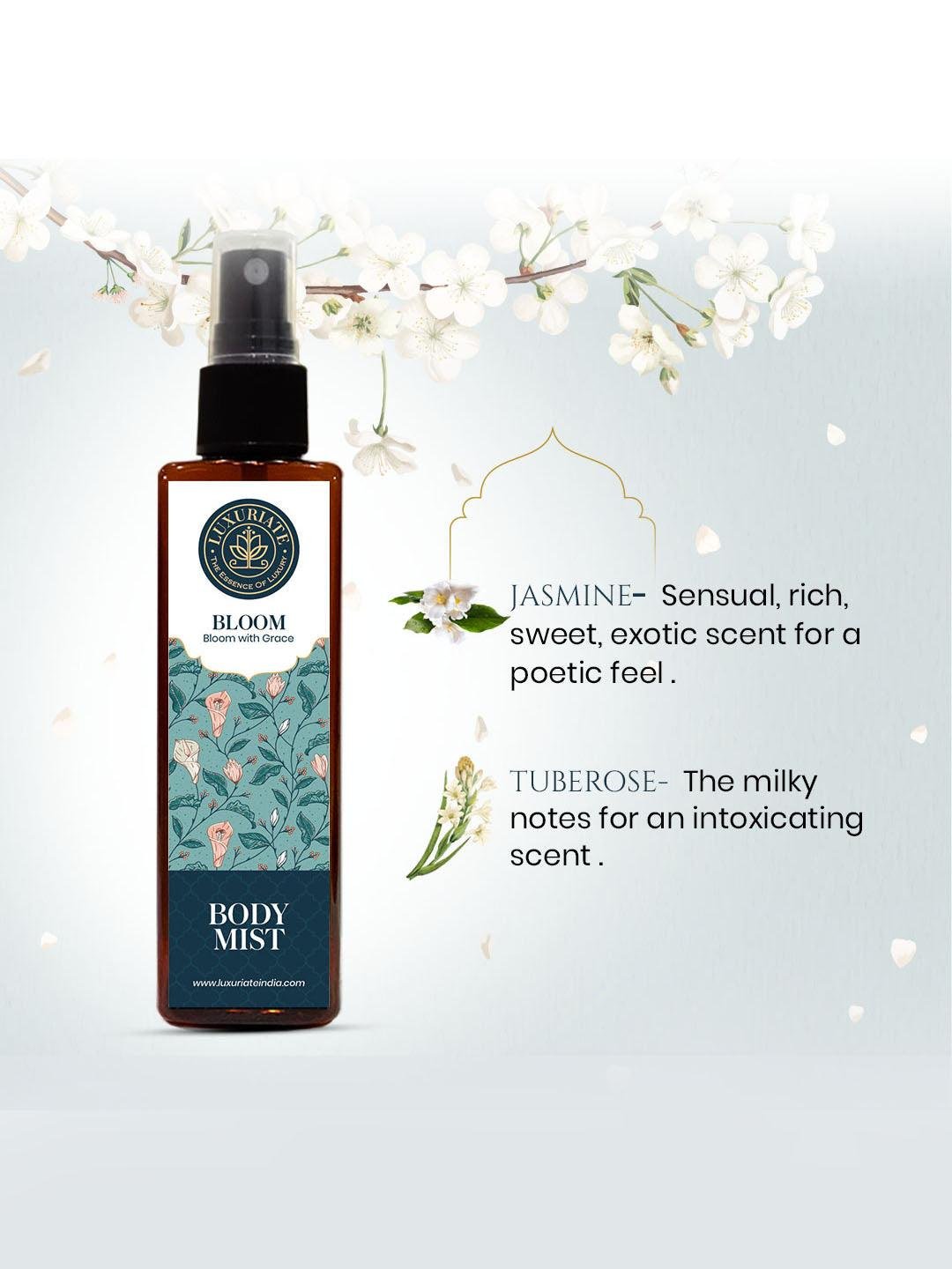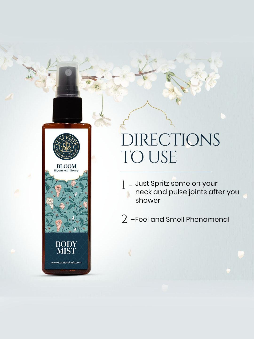 Luxuriate Bloom Body Mist Spray comes in a diverse range of pretty pet bottles, which fit perfectly into your bag or backpack. Plus, these tantalizing fragrances are perfect for a day out or an after-party. Add this to your everyday routine and envelope your senses in this subtle, delicate, warm fragrance of Bloom. This long-lasting body mist is a warm & sensual blend aroma that is sure to make you irresistible from head to toe.
