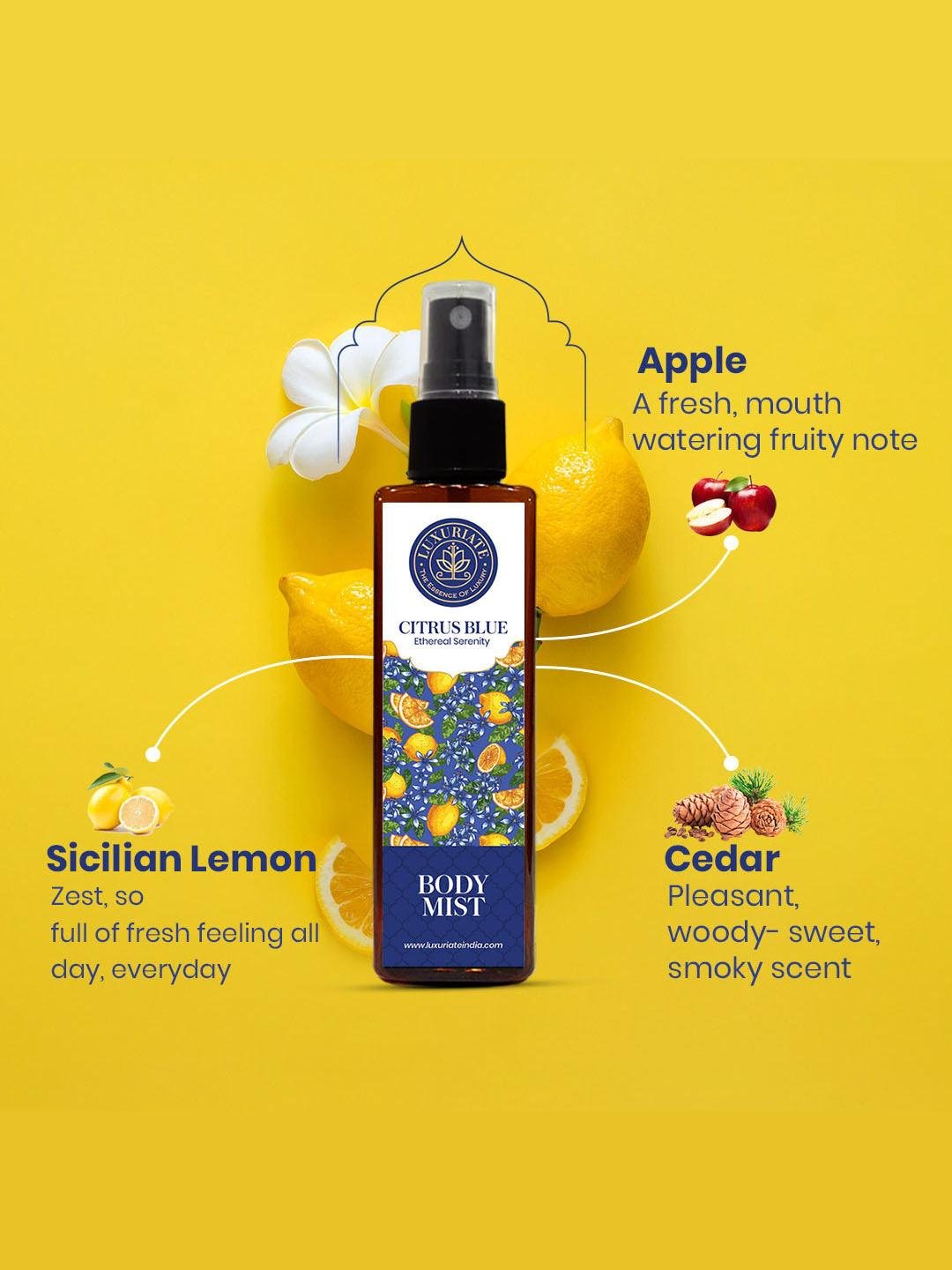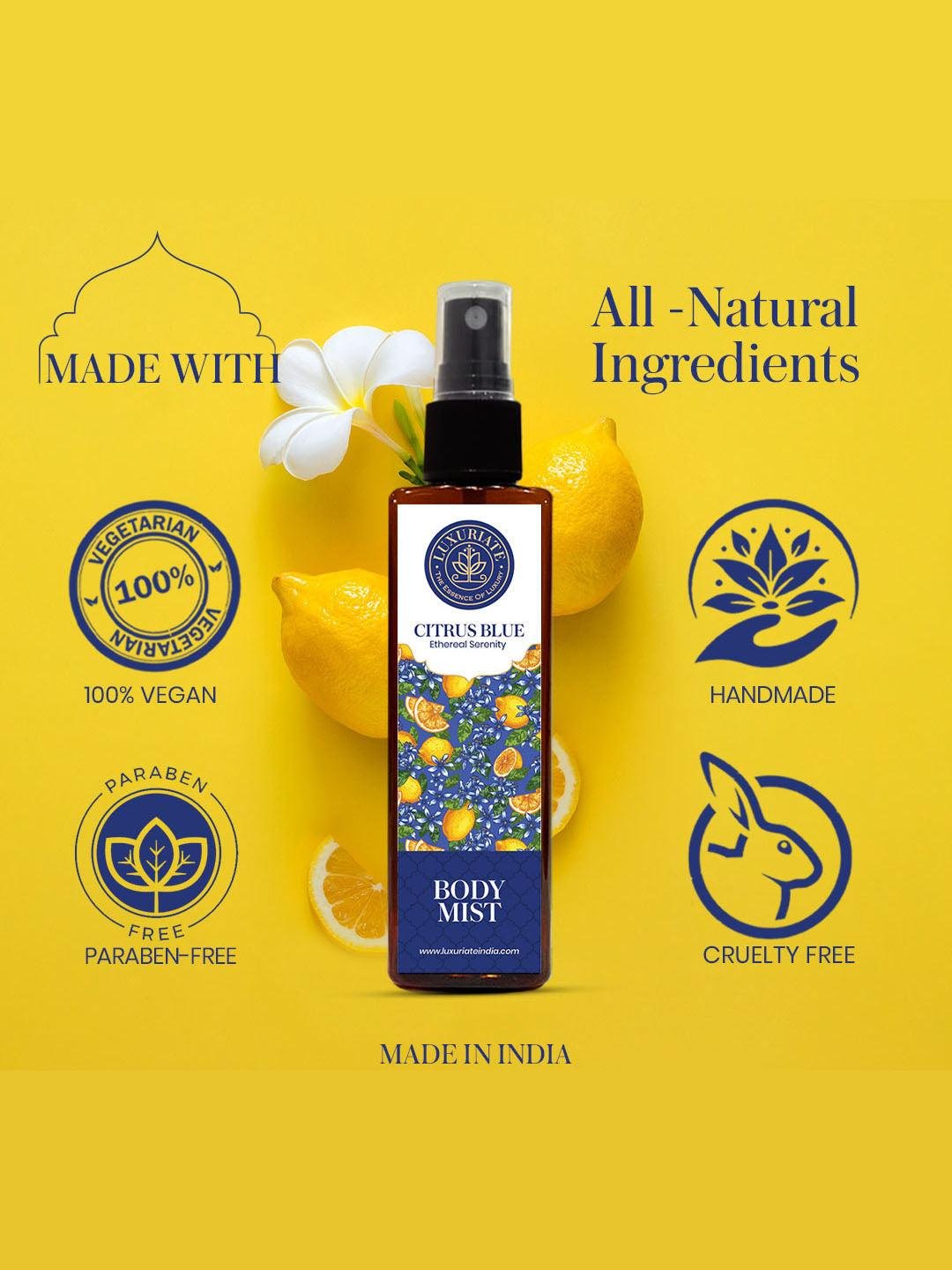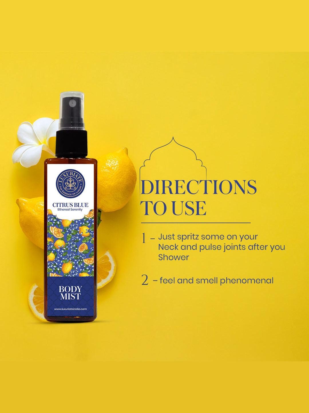 Luxuriate Citrus Blue Mist Fragrance Body Mist Spray comes in a diverse range of pretty pet bottles, which fit perfectly into your bag or backpack. Plus, these tantalizing fragrances are perfect for a day out or an after-party. Body Mist that delivers a blissful aroma all day long. Drizzle directly on the pulse points for adding warmth, spice and hydration to your daily regime. This body mist is crafted with pure ingredients sourced from nature to leave your skin nourished & senses, awakened.