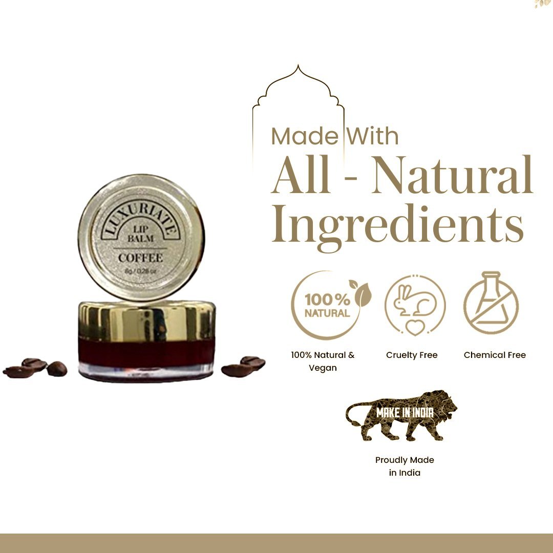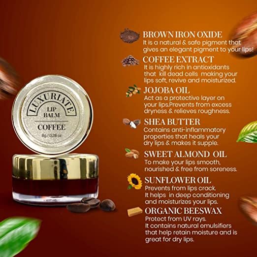 Luxuriate Coffee Lip Balm has the outstanding ability to hydrate, nourish and heal sensitive skin providing you to have soothing lip protection at all times. A most effective formula, which naturally moisturizes and soothes dry chapped lips. The Coffee Lip Balm moisturizes chapped lips, nourishes and smoothens lips, and reduces pigmentation for an even-toned pout.