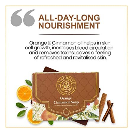 Orange Cinnamon Soap : Luxuriate Soap Treat your skin with Cinnamon's antibacterial essence to fight acne or breakouts and eliminate spots. Feel touched by natures own spa while you meditate.