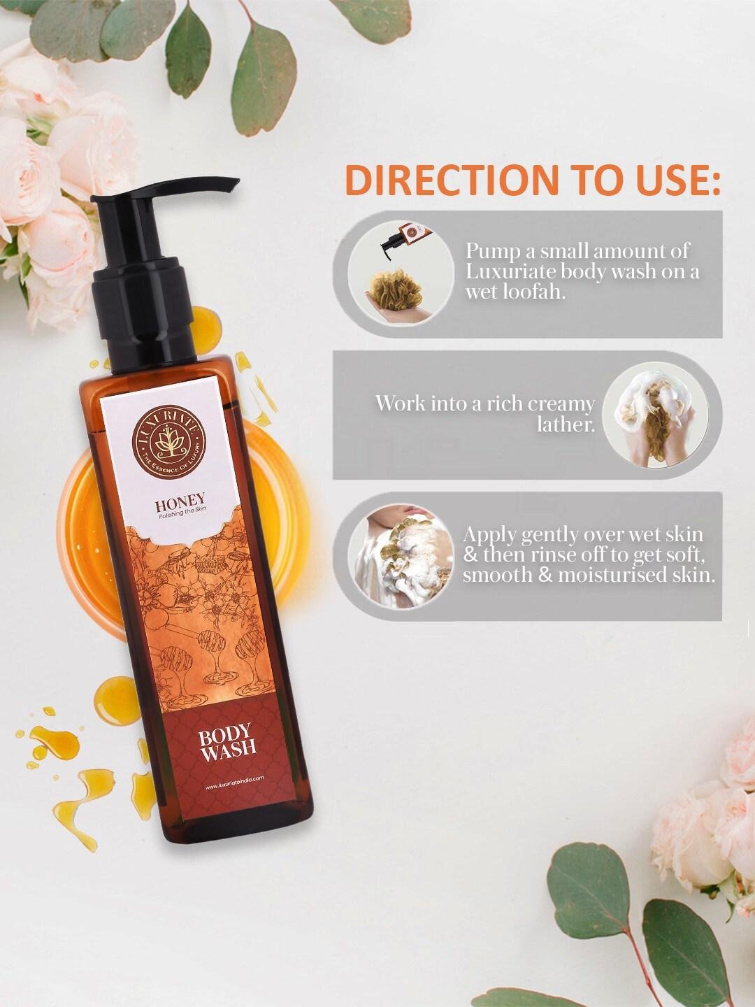 Luxuriate Honey Body Wash Shower Liquid is a proportionate blend of 100% pure and natural Honey from face to toe soap free Body Wash from Luxuriate that soothe your skin while relieving tension with the powerful effect of Honey. A daily shower with this luxuriate body wash gently exfoliates, deeply nourishes and restores your skin, leaving it healthy and hydrated. It?s sweet aroma also lifts up your mood and refreshes your senses.It is an effective cleanser that leaves your skin feeling fresh, healthy and clean. The gentle fragrance leaves behind a trail of freshness and calms senses.