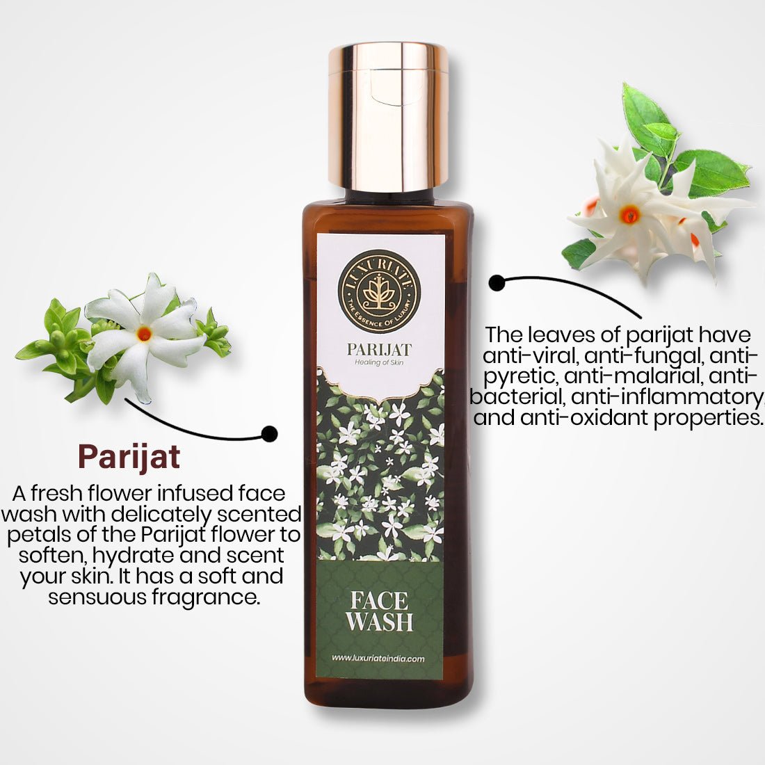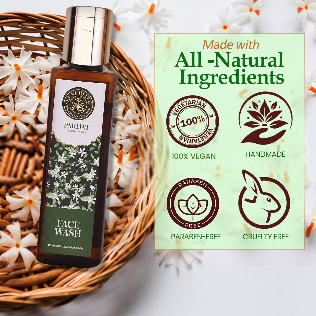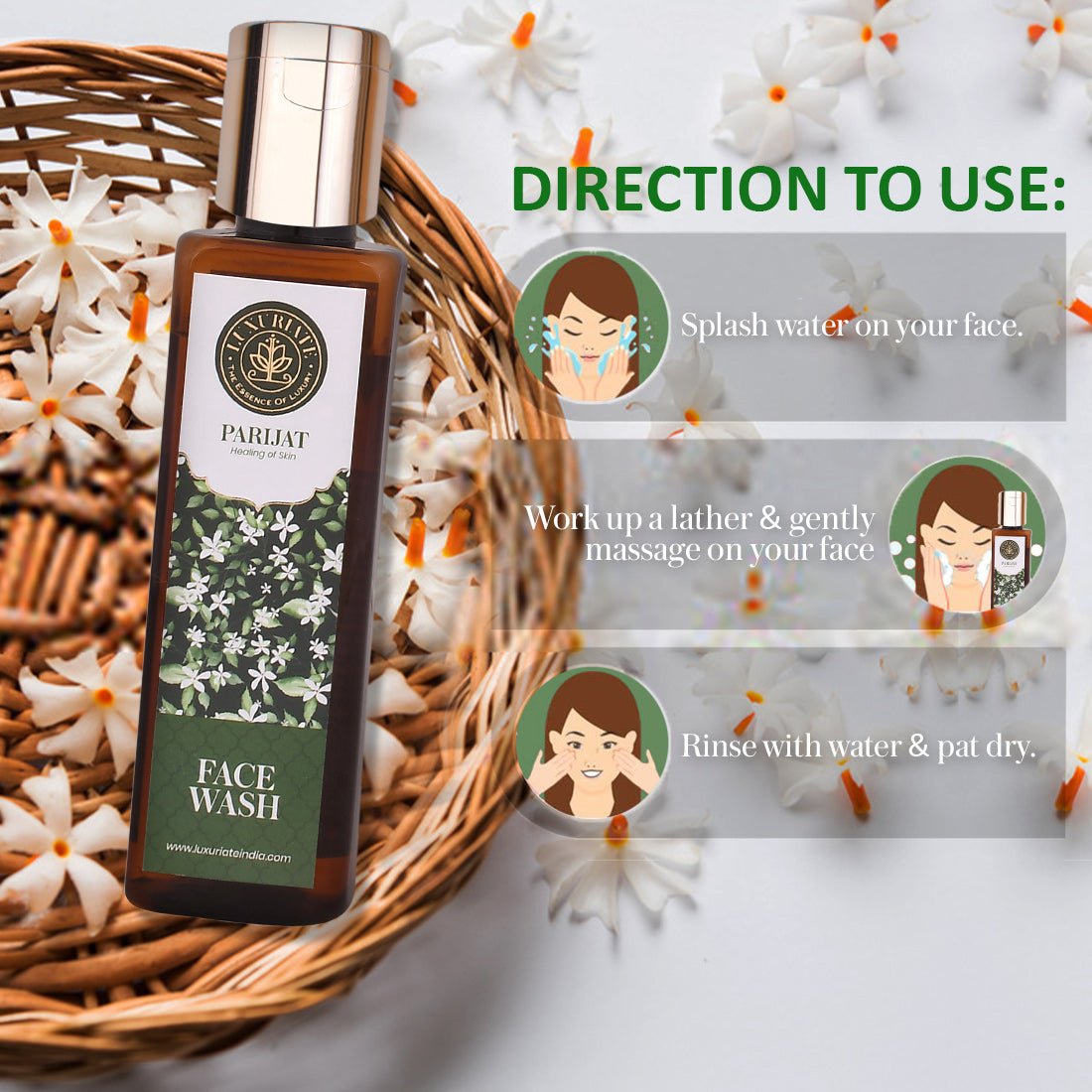 Luxuriate Parijat Face Wash Cleanser is a natural face cleanser that leaves your skin bright, alive and satiny smooth. It contains Jasmine extracts that combine together to give a fresh start to the day and keep your skin youthful and vibrant. Suitable for all skin types(Oily Skin, Dry skin, Sensitive Skin, Dullness, Roughness, Combination Skin and normal Skin) comes in 100 ML Bottle for Men and Women. Luxuriate Parijat Face Wash enriched with the benefits of vitamins, it gives you flawless & glowing skin. A guaranteed remedy to a variety of skin ailments and pimple free radiant skin.