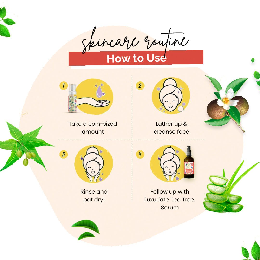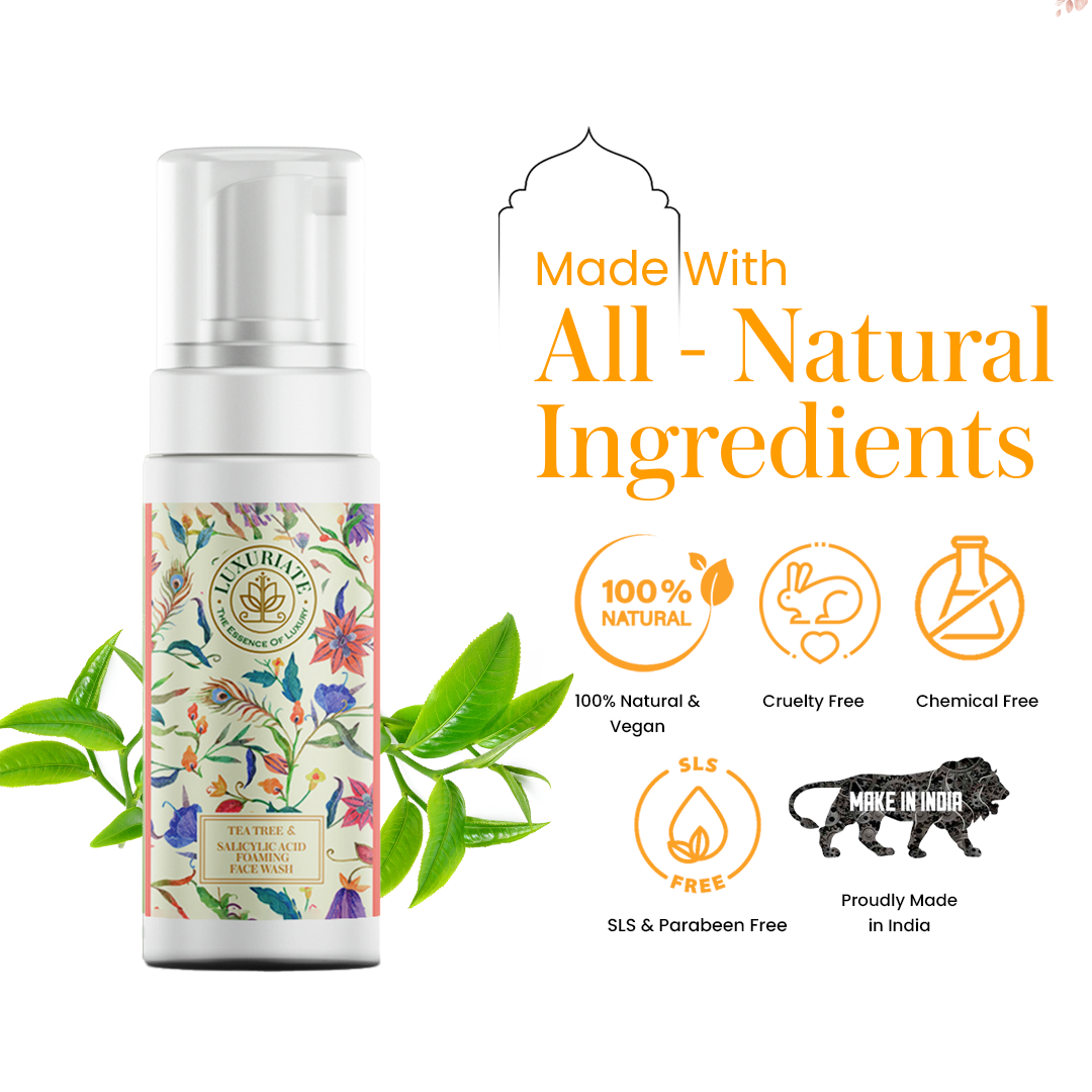 Luxuriate Tea Tree & Salicylic Acid Foaming Face Wash helps prevent breakouts, fights hyperpigmentation and sun damage Special skin soothers prevent irritation and over-drying For acne-prone skin. Antioxidants nourish the skin and improve skin tone Neem extract reduce inflammation and prevent infection. Skin Type : For all skin type.