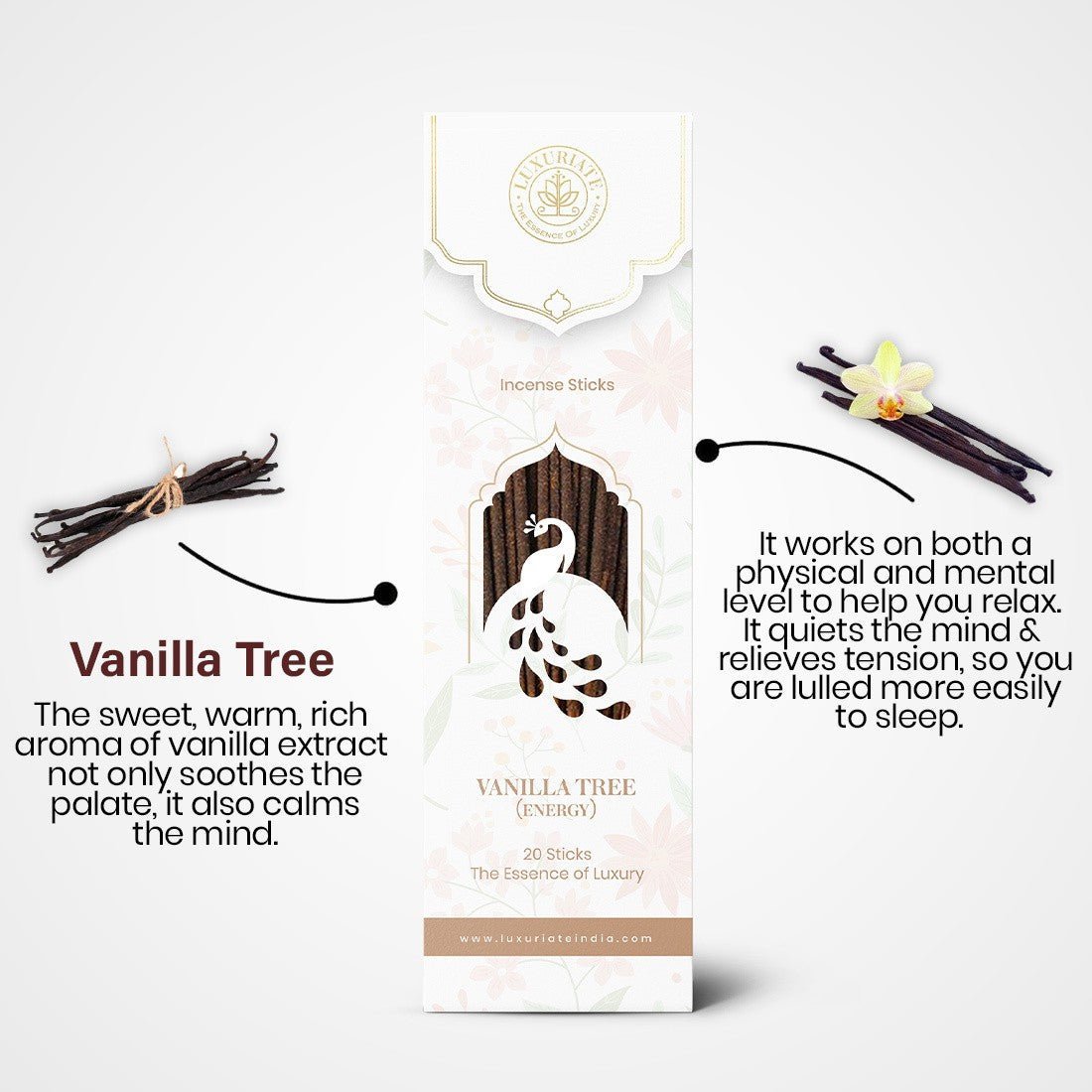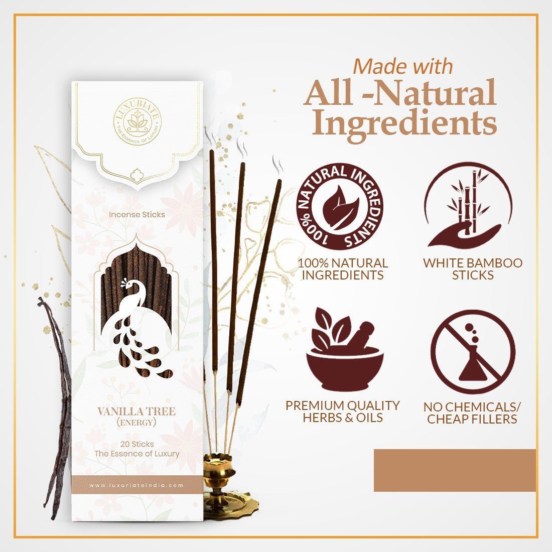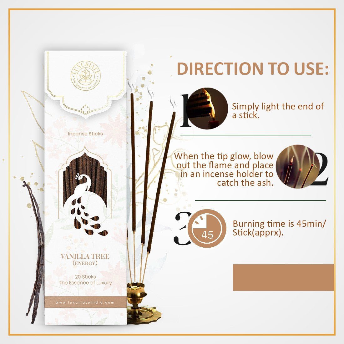 Luxuriate creates beautiful and fragrant from Vanilla Tree essential oil based incense sticks that infuse divinity and pleasure into the mundane and ordinary rituals of life. Luxuriate products are formulated by blending pure and natural ingredients with rare and exotic fragrances to offer their users a complete and unmatched mind and body experience. Luxuriate Incense sticks are aromatic biotic materials that allow a fragrant smoke to fill a room when burned. The aroma can be used for many reasons – for how it looks, smells and when combined with aromatic oils the scents can aid meditative practice and relaxation. Pure Herbal Sticks- Each stick is 9 inches long and comes with a long burning time of 40 – 45 minutes. Charcoal-free incense sticks dipped in natural essential oils. Organic Agarbatti are safe & healthy with lo smoke. Use it as you like it !!! *Puja *Yoga & Meditation *Prayer & Positivity *Room Freshener & Air Purifier.